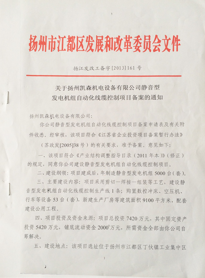 關于公司靜音型發(fā)電機組自動化線纜控制項目備案的通知